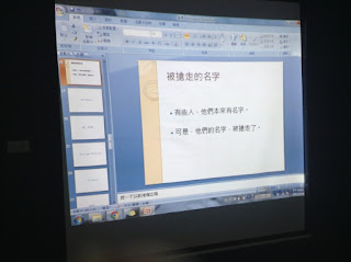 最後一張投影片,是我名字的台語羅馬拼音。我們會不會也是被搶走名字的一群人呢?幾個孩子們,只有阿恩會用台語說自己的名字。孩子們很有興致,我們開始查每個人名字該怎麼用台語發音。大家牙牙學語似的,學著說自己的名字。